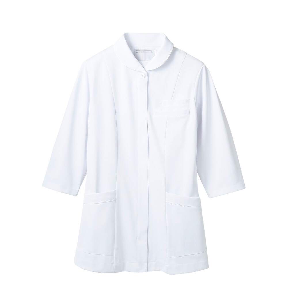 住商モンブランのメディカルジャケットです。 制菌・透け防止・制電・防汚加工を付与した、小さめの襟がポイントのキュートなジャケットです。