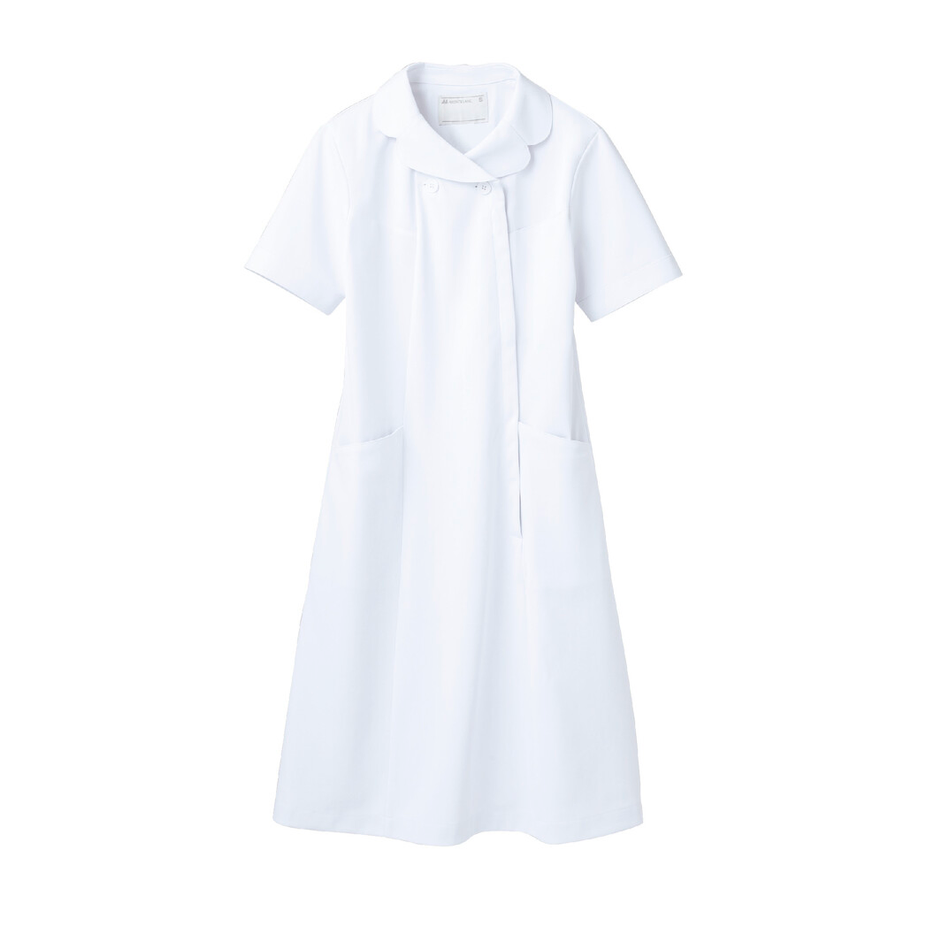 住商モンブランのメディカルワンピースです。 制菌・透け防止・制電・防汚加工を付与した、かわいい襟とダブルボタンで、印象に残る上品な装いのアイテムです。