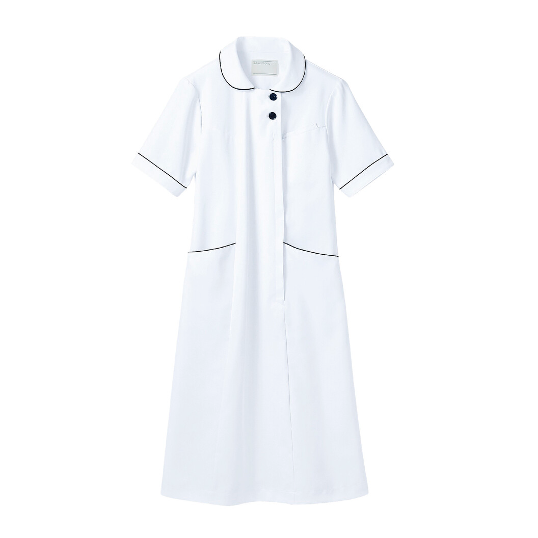 住商モンブランのメディカルワンピースです。 制菌・透け防止・吸汗速乾・制電・防汚加工を付与し、ほど良い大きさの襟と縦並びの2つボタンが品よく印象的なアイテムです。