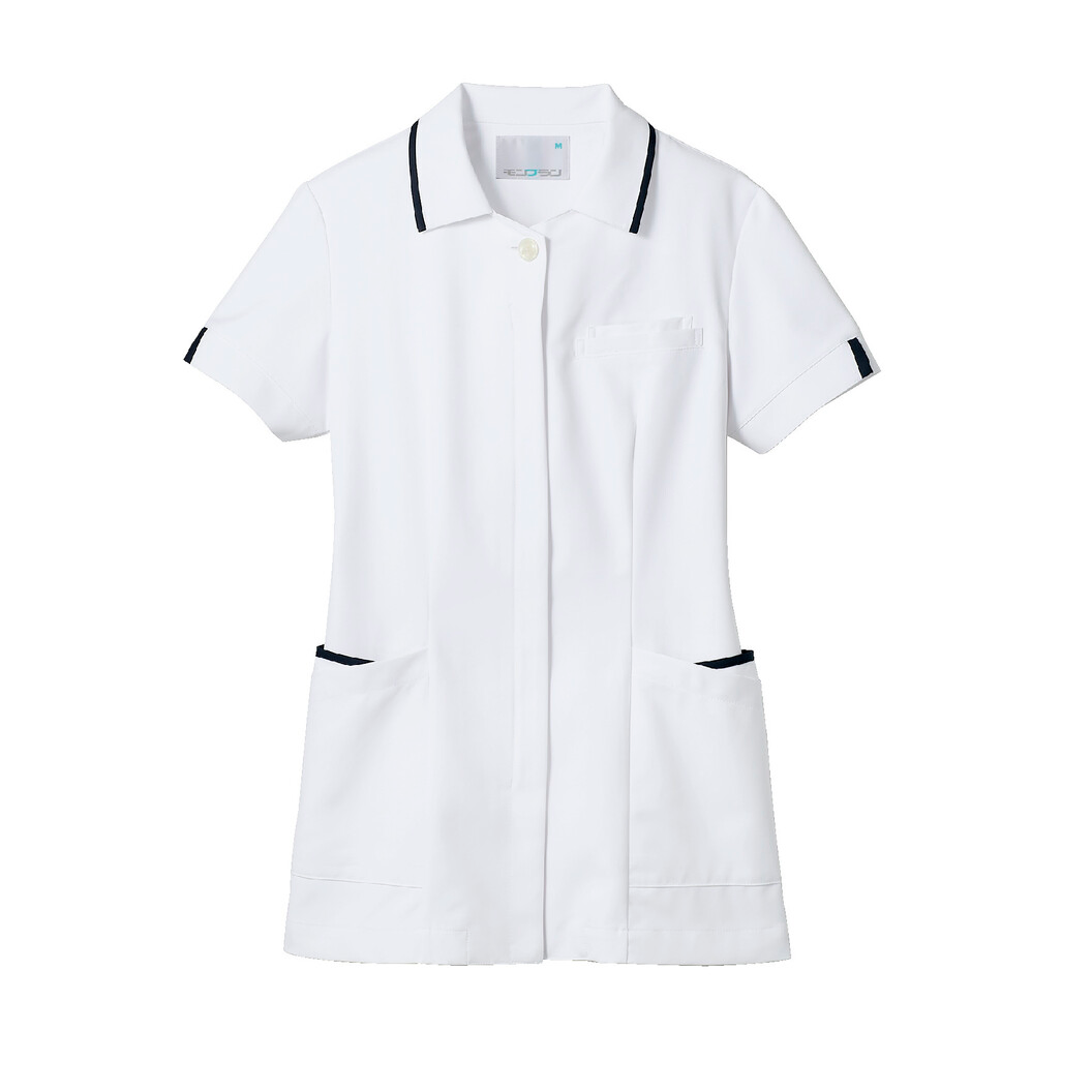 住商モンブランの半袖ナースジャケットです。 きちんと感のある襟付きデザインで、上品に着こなせます。 後ろは高めのベルトデザインで脚長に、袖口スリットで二の腕をほっそりと見せます。 持ち物が取り出しやすく整理しやすいダブルポケット。吸汗速乾、制電、制菌加工など機能も多彩。 薄手で軽くしなやかな素材に防汚加工・透け防止加工で、白でも安心して着用できます。