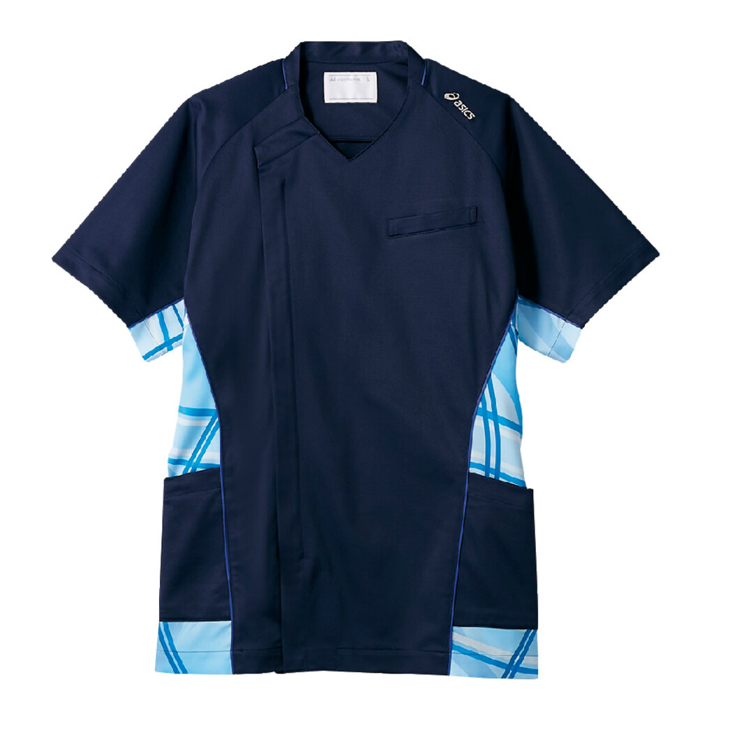 半袖スクラブのレディスサイズです。 両サイドにあしらったプリント生地の配色で、スポーティーな印象を演出します。 ストレッチ性に優れたワープニット素材で、動きもスムーズ。 なめらかな肌ざわりと軽い着心地もポイントです。 脇下には、衣服内の通気性を高めるベンチレーション付き。 左肩にはアシックスのロゴをあしらい、スナップボタンで脱ぎ着も簡単です。 内ポケット付きの脇ポケットやウエストループのほか、制菌加工、吸汗速乾、防汚、制電など機能も充実です。 (両サイドのプリント生地の模様は一着ごとに異なります。)