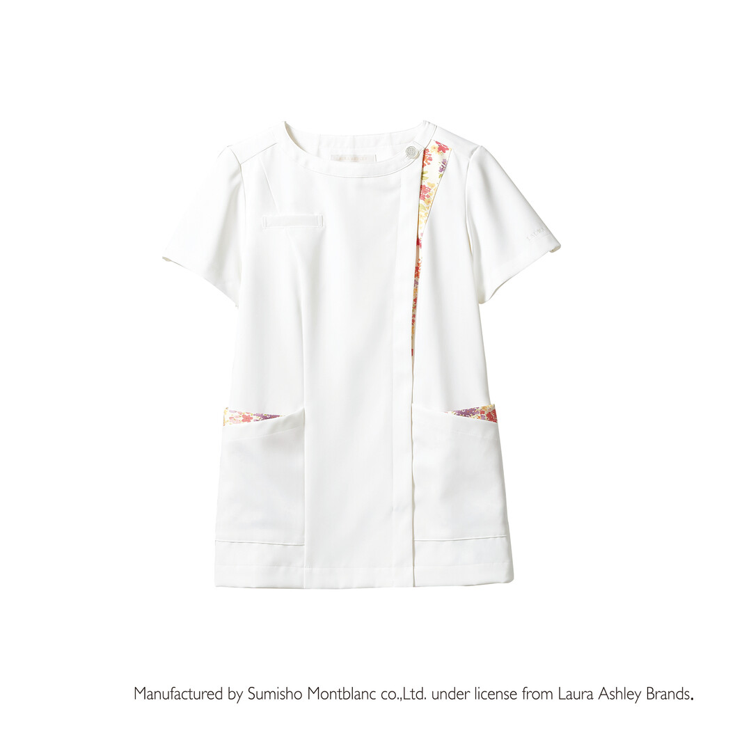 制菌・透け防止・吸汗速乾・制電・防汚加工を付与した、「LAURA ASHLEY」ブランドのメディカルジャケットです。 アシメントリーの合わせにボートネックで顔まわりもすっきり!