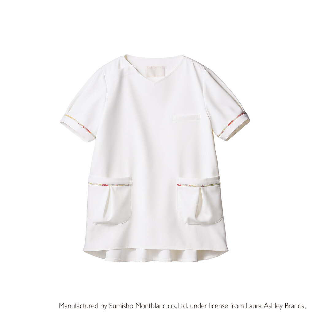 制菌・透け防止・吸汗速乾・制電・防汚加工を付与した、「LAURA ASHLEY」ブランドのスクラブです。 ふわりと広がるペプラム風の切り替えで後ろ姿も華やかに。