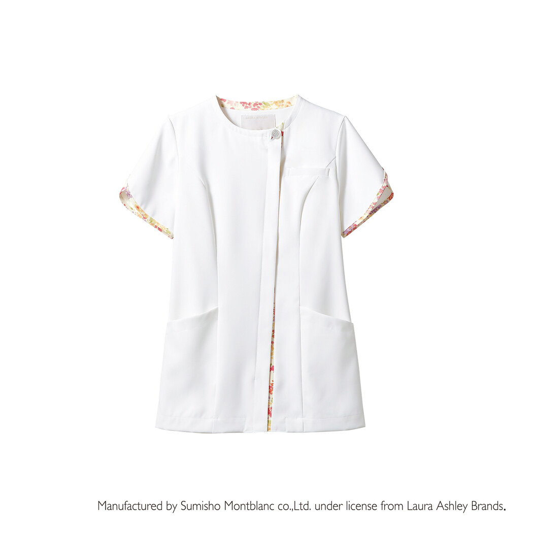 制菌・透け防止・吸汗速乾・制電・防汚加工を付与した、「LAURA ASHLEY」ブランドのワンピースです。 動くたびに見え隠れする花柄がポイント、袖のカッティングやアシメントリーな合わせなども印象的!