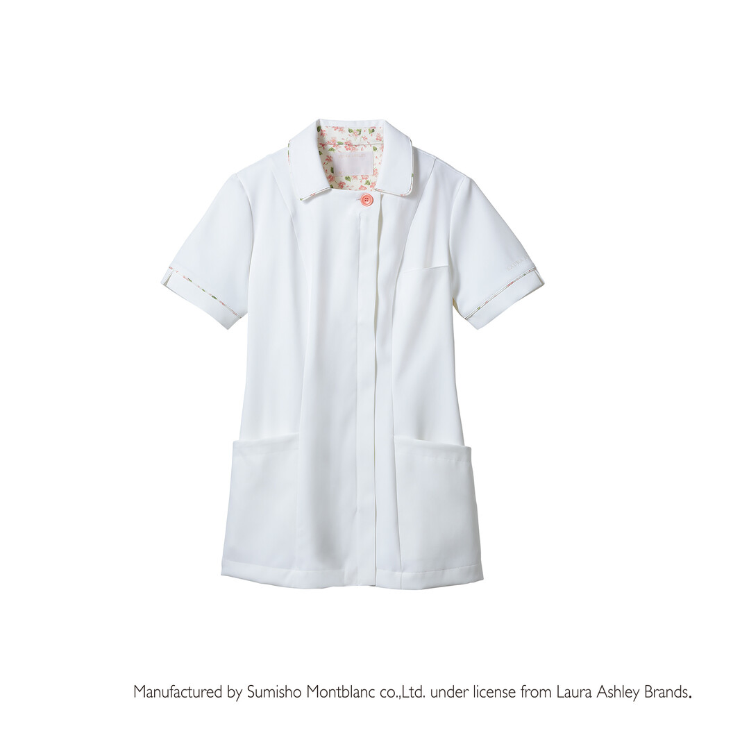 イギリスのライフスタイルブランド「ローラ アシュレイ」シリーズのアイテムです。 コンパクトな襟にパイピングの彩りをあしらって、凛とした印象に。 体のカーブに自然に寄り添うシルエットがきれいなラインを演出。 透けにくい素材だから、安心して着られます。 背裏や袖口部分に花柄生地をアクセントとして使用。 時計などがかけられる便利なウエストループ付き。 生地機能は制菌・吸汗・制電・防汚機能付きです。