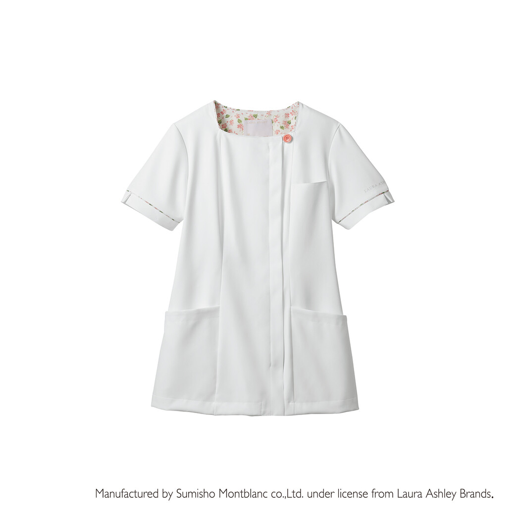 イギリスのライフスタイルブランド「ローラ アシュレイ」シリーズのアイテムです。 デコルテラインがきれいに見えるスクエアネックで、すっきり華奢な印象。 ウエストをさりげなく絞ったフェミニンなシルエットもポイント。 透けにくい素材だから、安心して着られます。 背裏や袖口部分に花柄生地をアクセントとして使用。 時計などがかけられる便利なウエストループ付き。 生地機能は制菌・吸汗・制電・防汚機能付きです。