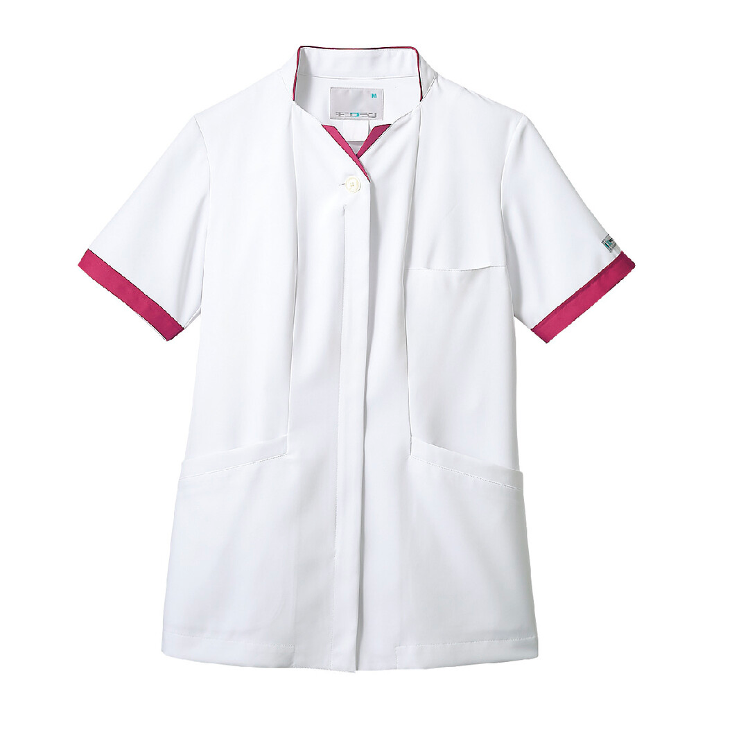 住商モンブラン「プロ・プライド」シリーズの半袖ナースジャケットです。 襟もとのV字カットが顔まわりをすっきりと、袖口の配色が二の腕をほっそり見せます。 後ろは高めの位置にベルトデザインを入れて、すらりと脚長に。 ほどよいストレッチ性があり、肩の上げ下げもスムーズです。 PHS専用ポケットで落下を防ぎ、ストラップも直接首にかかりません。 インク染み防止ポケットやループ付きポケットのほか、吸汗速乾、制電、制菌加工など機能も多彩。 防汚加工・透け防止加工で、白でも安心して着用できます。