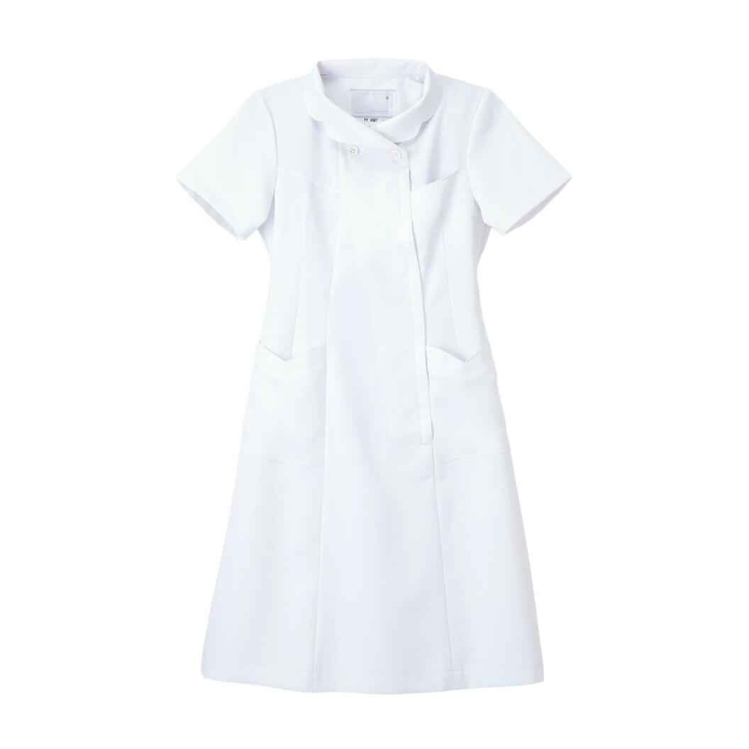 花びらを思わせるソフトな襟に、思わず看護の張りつめた空気が和らぎます。シルエットの美しい素材がよりやさしさを強調します。ポケットのやさしいカーブは物が落ちにくい構造にもなっています。 変形綾織り組織により、上品なドレープ性と優しい表面感を表現しています。環境に配慮したエコマーク適合素材です。再生フルダル糸と織組織により、高い防透け性を実現しています。軽いストレッチ性が着心地感をアップします。特殊仕上により吸水、防汚効果を付加しています。業務用洗濯にも耐えうる形態安定素材です。