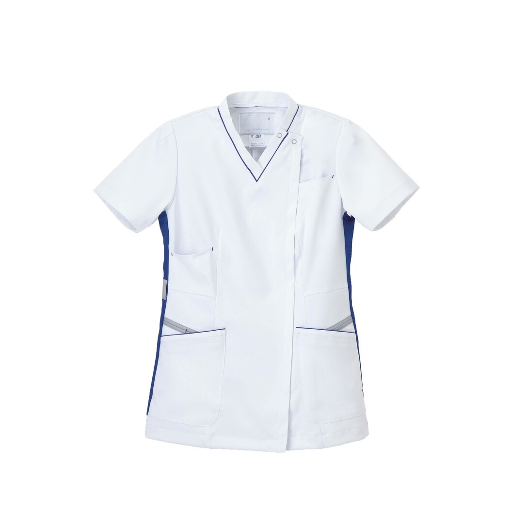 スクラブとチュニックを融合させた新しいスタイルです。美しくシャープなシルエットが信頼感を感じさせます。 特殊断面フルダル糸を使用し、高い防透け性能と吸汗速乾性を持っています。高い伸縮性による着心地の良さと動きやすさを持った素材です。特殊仕上により吸水、防汚効果を付加しています。業務用洗濯にも耐えうる形態安定素材です。