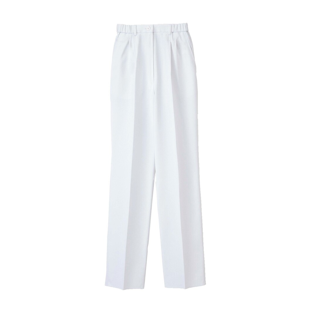 前ウエストタック入りで、前から後ろまでウエストゴム入りのゆったりシルエットのパンツです。 シルキーな光沢糸により、上品な陰影効果を出しています。再生ポリエステル糸を使用しているためグリーン購入法に対応できます。適度な伸縮性が動きやすさをもたらせています。特殊仕上により吸水、防汚効果を付加しています。業務用洗濯にも耐えうる形態安定素材です。