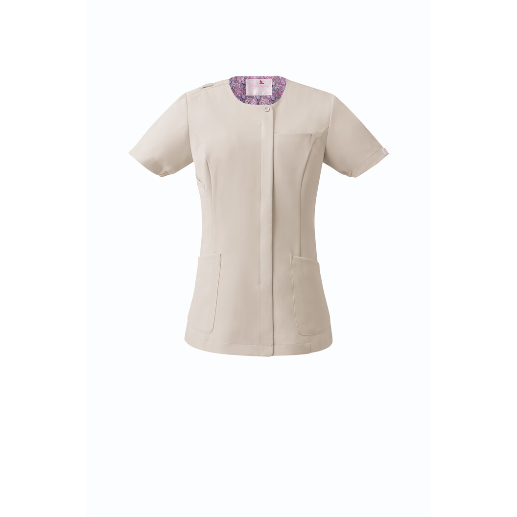 ワコールHIコレクションシリーズのニュアンスカラーが優しい印象で鮮やかなレディースジップスクラブ。優れた吸水性と拡散性、ドライ感を実現したストレッチ素材であるネオαを使用したことで、オールシーズン快適な着心地です。羽織って着られるジップタイプなので着脱が楽チン。着脱時に髪が乱れたりメイクが崩れる心配もなく安心です。V開きが多いスクラブですが、胸元の開きが気にならならない丸襟や、袖の開きを抑える袖下ゴムなど、女性が嬉しい仕様に。シンプルなデザインでありながら、前立ての白いパールドットの釦と、丸みを帯びたタック袖でらしい印象のデザインに仕上げた、ワコールHIコレクションシリーズのレディースジップスクラブです。