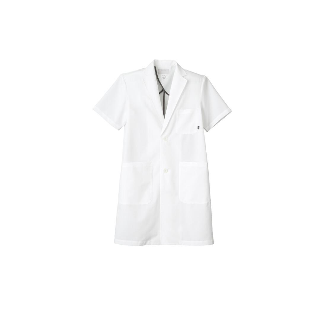 超軽量の男性半袖LABコート(ドクターコート)はスクラブとのコーディネートで新しいクールビススタイル。通気性の良い、穴あきの素材で、撥水加工が施され穴あきでも水を弾く機能性素材です。ストレッチ性にも優れているので、スクラブや白衣の上にコートを羽織っても動きを妨げることなく、さまざまな動きに柔軟に対応してくれます。風が通る、水を弾く、ファスナーが重く感じるほど超軽量なので夏場には特におすすめの男性用半袖コートです。