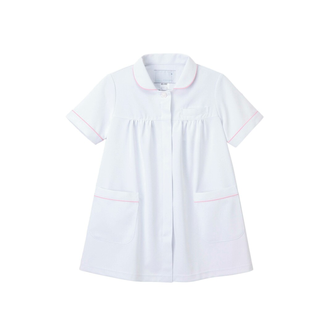 胸元のギャザーがやさしい雰囲気とゆったりしたシルエットをもたらします。配色のコードが楽しさをプラスしています。 光の透過性を抑えた高ランダム扁平断面糸(アレニエ)を使用することにより、高い防透性を実現しました。適度な伸縮性が動きやすさをもたらせています。特殊仕上により吸水、防汚効果を付加しています。業務用洗濯にも耐えうる形態安定素材です。