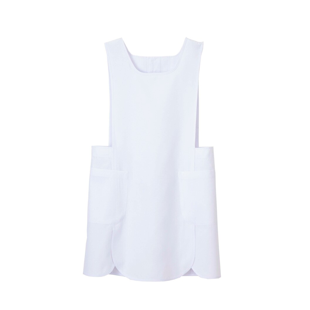 前裾はスリット機能を持った優しい丸みのあるデザイン。後ろ止めは、ヨークのようなデザインにより、肩ひもが落ちる心配はありません。ウエストはアジャストできる内側ひも付きです。 再生ポリエステル糸を使用しているためグリーン購入法に対応できます。特殊プレス仕上げのため、洗濯後も美しい仕上がりが維持されます。特殊仕上により制電、吸水、防汚効果を付加しています。業務用洗濯にも耐えうる形態安定素材です。