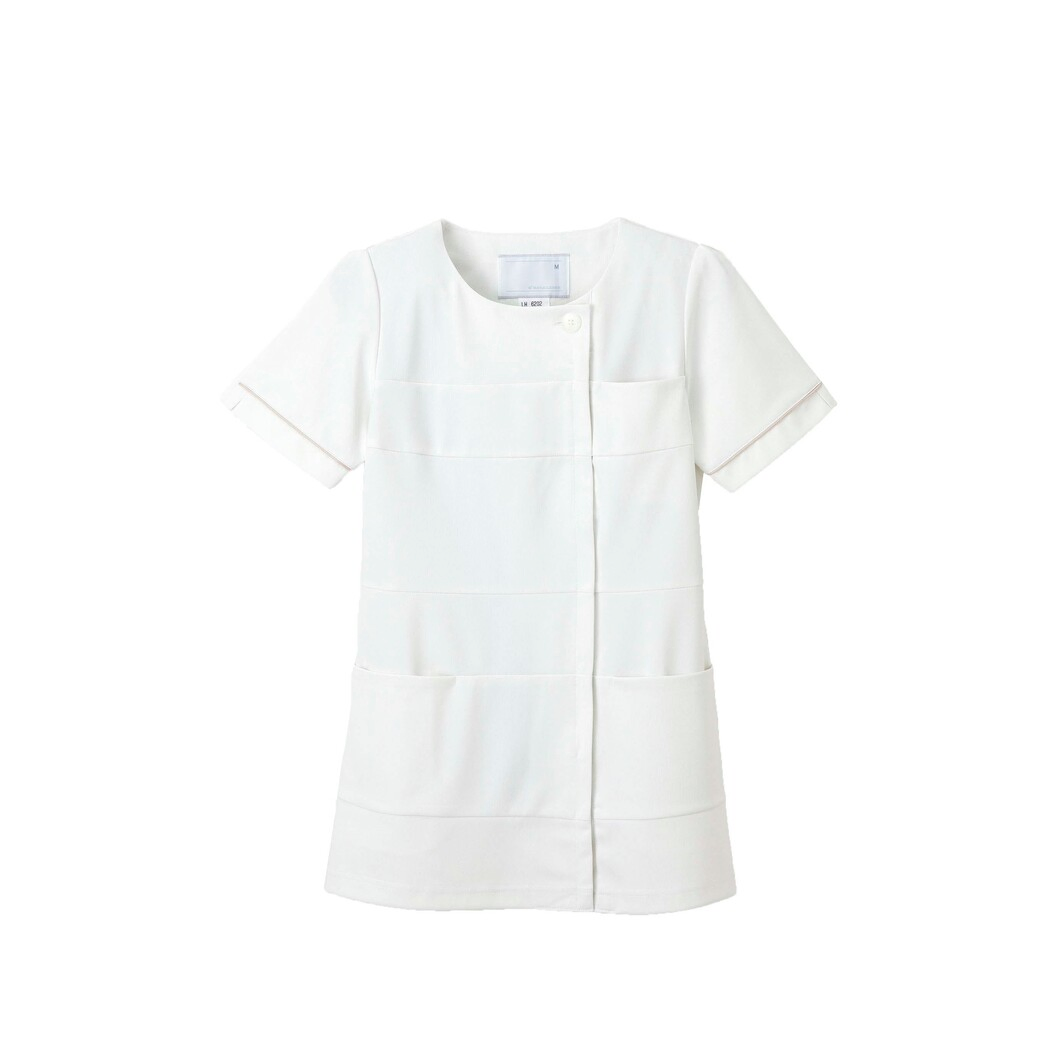 高級感とモード感のあるカッティングと女性らしいやさしさが感じられるノーカラーのデザインはおもてなしの心を表現しています。 透け防止フルダルポリエステル糸使いにより、極めて高い透け防止効果があります。極めて高いストレッチ性が有ります。特殊な糸使いにより、肌に触れるとヒヤっとする接触冷感素材です。ニット素材のため、通気性があり、防皺性にも優れています。洗濯耐久性のある制菌加工を施し、清潔で快適に着用していただけます。着用時のまとわりつきや、パチパチ放電を低減させるために制電糸を使用しています。業務用洗濯にも耐えうる形態安定素材です。