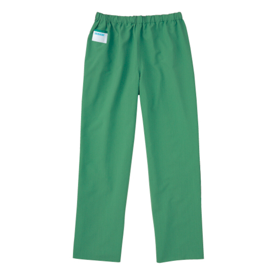 手術スラックスです。 右後ろポケット付、右脇(ネーム)部分にカラーテープ付、ウエストゴム仕様(共地ひも入り)です。
