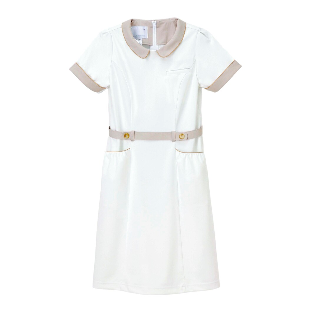 フラットカラーとウエストベルト、そしてポケット口のギャザーなど女性らしい優しさが感じられるディティールが散りばめられたワンピースです。 透け防止フルダルポリエステル糸使いにより、極めて高い透け防止効果があります。極めて高いストレッチ性が有ります。特殊な糸使いにより、肌に触れるとヒヤっとする接触冷感素材です。ニット素材のため、通気性があり、防皺性にも優れています。洗濯耐久性のある制菌加工を施し、清潔で快適に着用していただけます。着用時のまとわりつきや、パチパチ放電を低減させるために制電糸を使用しています。業務用洗濯にも耐えうる形態安定素材です。