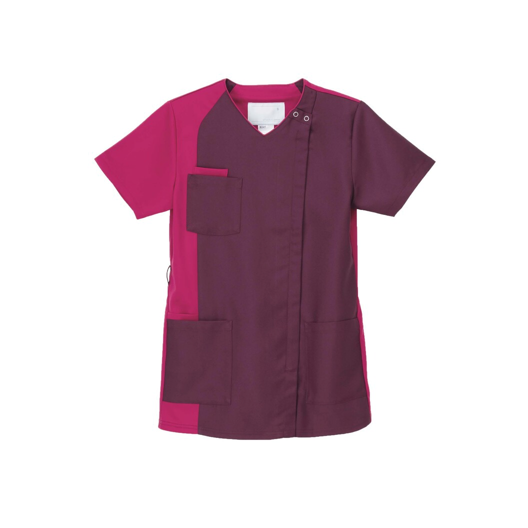 アシンメトリーなデザインが斬新で自由なイメージのスクラブです。涼感機能のあるニット素材の使用量を従来の2倍に増やし、動きやすさと通気性をアップさせています。適度なゆとりのあるシルエットになっています。 さらさらタッチのポリエステル織物素材です。濃色でも他のポリステルに移染しにくい素材です。特殊仕上により吸水、防汚効果を付加しています。業務用洗濯にも耐えうる形態安定素材です。