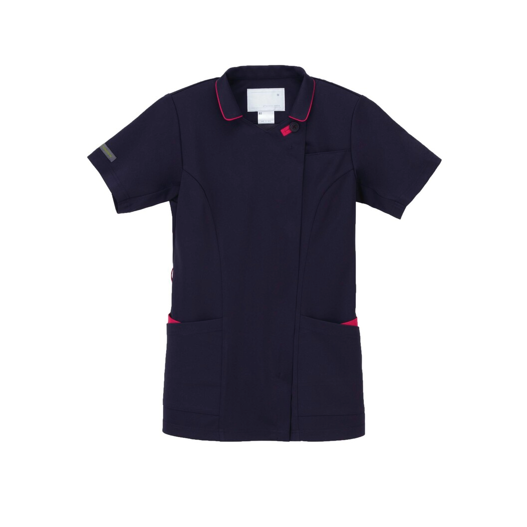 カラーチュニックという新しいアイテム。玉縁テクニックがデザイン性と高級感を高めています。素材はなめらかなタッチと涼感性、高ストレッチ性を併せ持つ高機能ニットを使用しています。さらにエアーアームカットを搭載し涼しく動きやすいハイスペックアイテムです。 均一できめ細やかな美しい表面感としなやかでソフトなタッチを特徴としています。また上品な光沢と発色性が高級感を感じさせます。高い伸縮性を持ち、着心地の良さと動きやすさを提供します。特殊な糸使いにより、肌に触れるとヒヤっとする接触冷感素材です。ニット素材のため、通気性があり、防皺性にも優れています。特殊仕上により吸水、防汚効果があります。着用時のまとわりつきや、放電による不快感を低減させるために制電糸を使用しています。業務用洗濯にも耐えうる形態安定素材です。