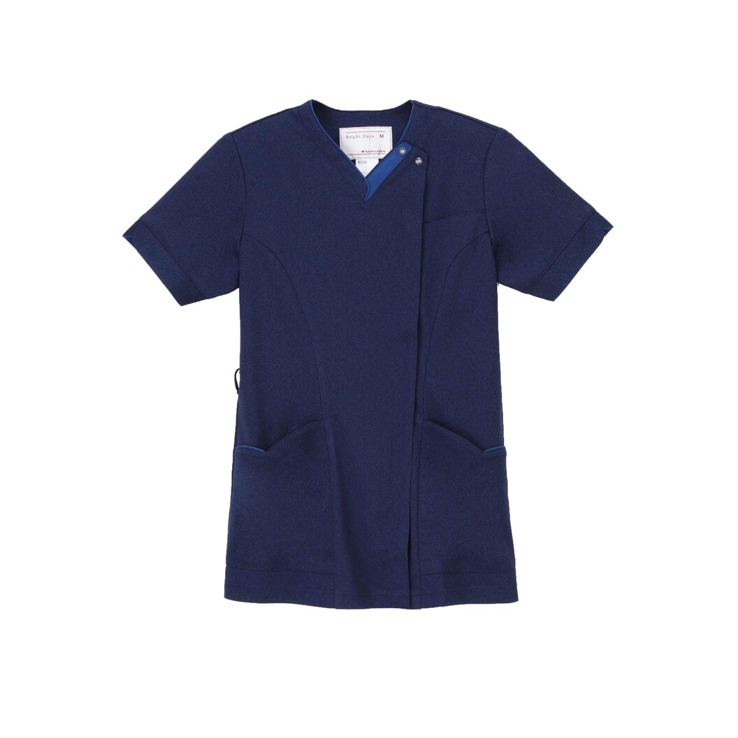 女性らしいやさしさが感じられるスクラブデザイン。シャープなスクラブアイテムでありながら曲線を多用したデザインが優美さを感じさせます。 カラーがミックスしている杢調が美しい独特な光沢を生み、高級感が感じられる素材です。通気性の良い接触冷感素材です。高い伸縮性を持ち、着心地の良さと動きやすさを提供します。特殊仕上により吸水、防汚効果を付加しています。業務用洗濯にも耐えうる形態安定素材です。