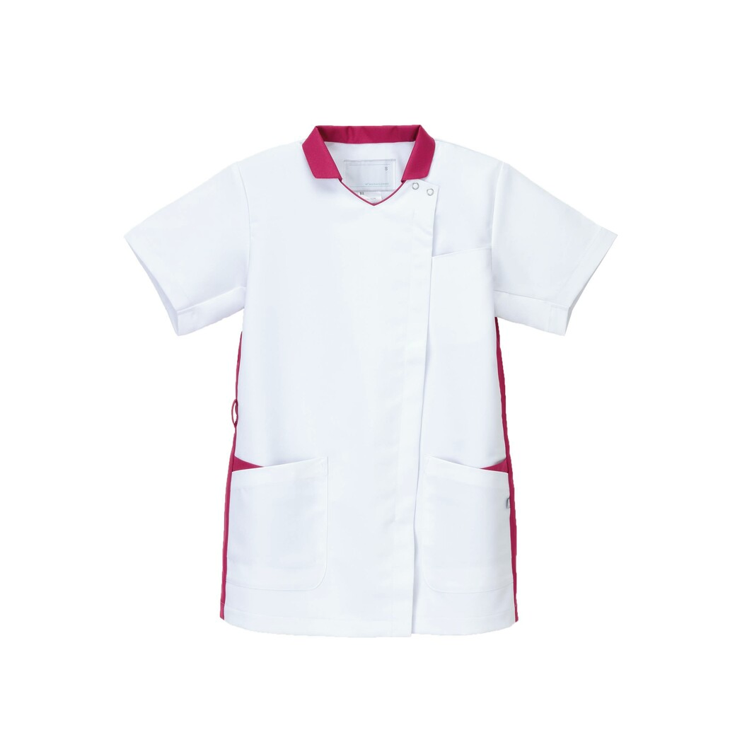 スクラブのシャープな印象と襟付きチュニックのきちんと感を併せ持つハイブリッドメディウェア。配色になっている襟がデザイン性と標識性を高めています。さらにエアーアームカットを搭載し肩周りの動作性が向上しています。 上品な風合いのほどよいストレッチ素材です。フルダル糸使いのため防透性に優れています。特殊仕上により吸水、防汚効果があります。業務用洗濯にも耐えうる形態安定素材です。