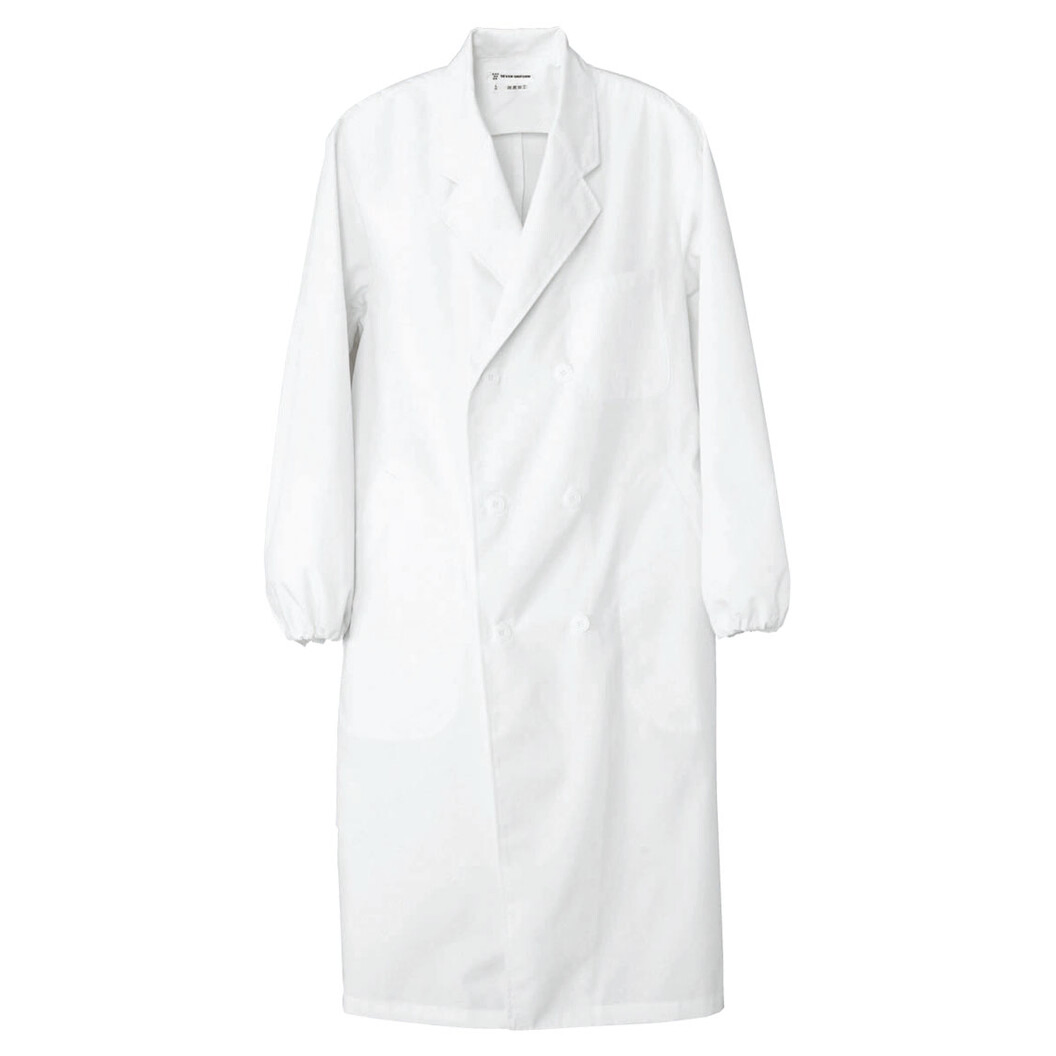 比較的薄い生地で作られたコートです。専門性の高いお仕事用コートです。学校での実験、薬剤師他。袖口には共紐が入っていますので、絞ることができますゆえに手を使う作業がしやすくなります。左胸ポケット、腰には左右ポケットあり。後ろにはベント開きあり、脚さばき良い。抗菌防臭機能あり。