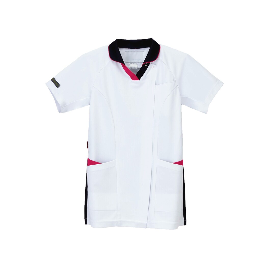 スクラブのシャープな印象と襟付きチュニックのきちんと感を併せ持つハイブリッドメディウェア。 素材は涼感高ストレッチ性を持つ高機能ニットを使用しています。 さらにエアーアームカットを搭載し動きやすさと涼しさを両立したプロファンクションシリーズアイテムです。 透け防止フルダルポリエステル糸使いにより、極めて高い透け防止効果があります。極めて高いストレッチ性が有ります。特殊な糸使いにより、肌に触れるとヒヤっとする接触冷感素材です。ニット素材のため、通気性があり、防皺性にも優れています。洗濯耐久性のある制菌加工を施し、清潔で快適に着用していただけます。着用時のまとわりつきや、パチパチ放電を低減させるために制電糸を使用しています。業務用洗濯にも耐えうる形態安定素材です。