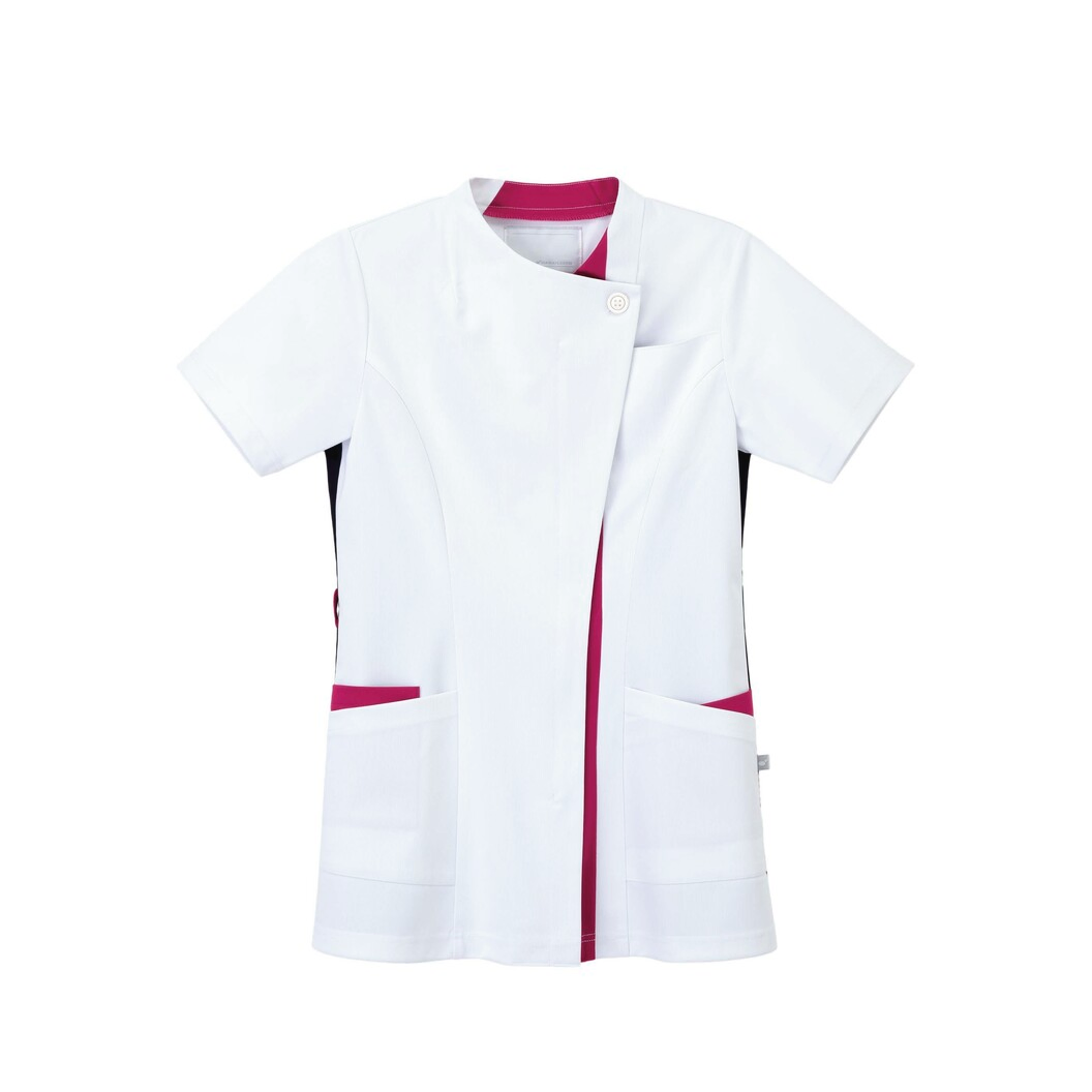 身頃から続け断ちの後ろハイネックや、アシンメトリー切り替えの配色がスタイリッシュなデザインスクラブ。 素材は涼感性、高ストレッチ性を持つ高機能ニットを使用しています。 飛沫感染予防の為に、衿ぐりの開きを浅くして肌の露出を控えました。 前ファスナーで羽織って着ることが出来る為、着脱が簡単です。 右腰のダブルポケットの内側はスマートフォンを収納できます。 両脇にネイビー配色のニット素材を使用し、スッキリとした印象に仕上げました。 透け防止フルダルポリエステル糸使いにより、極めて高い透け防止効果があります。極めて高いストレッチ性が有ります。特殊な糸使いにより、肌に触れるとヒヤっとする接触冷感素材です。ニット素材のため、通気性があり、防皺性にも優れています。洗濯耐久性のある制菌加工を施し、清潔で快適に着用していただけます。着用時のまとわりつきや、パチパチ放電を低減させるために制電糸を使用しています。業務用洗濯にも耐えうる形態安定素材です。