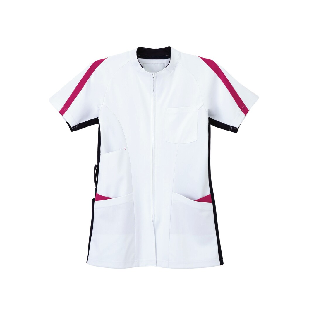 後ろ衿から肩袖口にかけて配色のラインを入れたスポーティな印象のユニセックスカラーチュニック。 素材は涼感性、高ストレッチ性を持つ高機能ニットを使用しています。 ハイネックの衿で肌の露出を控えました。 両脇にネイビー配色のニット素材を使用し、スッキリとした印象に仕上げました。 さらにエアアームカットを搭載し涼しく動きやすいハイスペックアイテムです。 透け防止フルダルポリエステル糸使いにより、極めて高い透け防止効果があります。極めて高いストレッチ性が有ります。特殊な糸使いにより、肌に触れるとヒヤっとする接触冷感素材です。ニット素材のため、通気性があり、防皺性にも優れています。洗濯耐久性のある制菌加工を施し、清潔で快適に着用していただけます。着用時のまとわりつきや、パチパチ放電を低減させるために制電糸を使用しています。業務用洗濯にも耐えうる形態安定素材です。