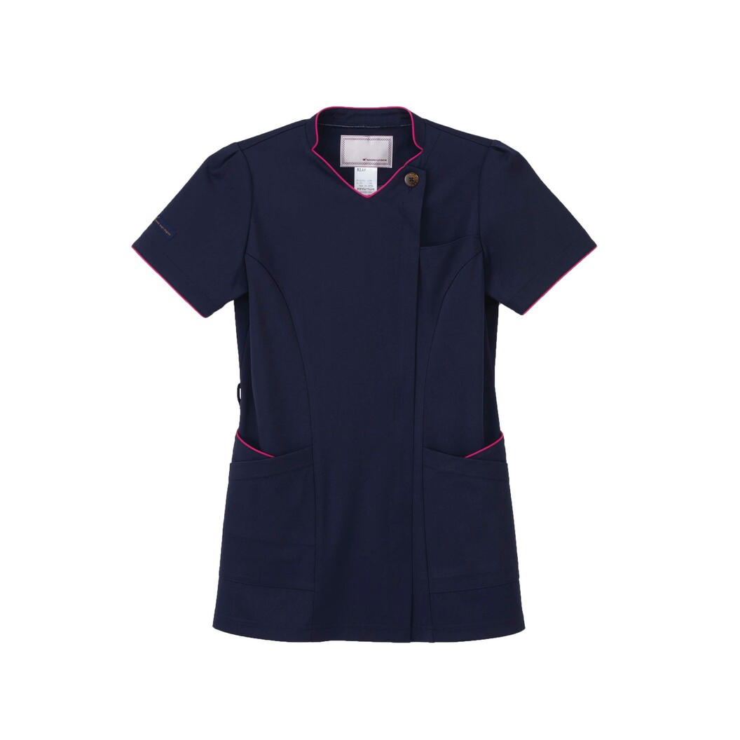 曲線を用いたネックラインは女性らしい上品な優しさを表現しています。 右腰のダブルポケットの内側はスマートフォンを収納できます。 またフロントファスナー開き仕様ですので着脱が容易です。 素材は涼感性、高ストレッチ性を持つ高機能ニットを使用しています。 均一できめ細やかな美しい表面感としなやかでソフトなタッチを特徴としています。また上品な光沢と発色性が高級感を感じさせます。高い伸縮性を持ち、着心地の良さと動きやすさを提供します。特殊な糸使いにより、肌に触れるとヒヤっとする接触冷感素材です。ニット素材のため、通気性があり、防皺性にも優れています。特殊仕上により吸水、防汚効果があります。着用時のまとわりつきや、放電による不快感を低減させるために制電糸を使用しています。業務用洗濯にも耐えうる形態安定素材です。
