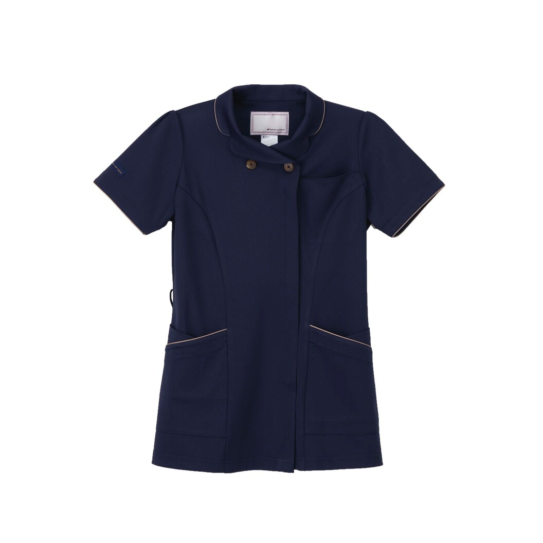 やわらかい印象の襟付きタイプです。 花びらのような襟が女性らしいやさしさを感じさせます。 また色の組み合わせが落ち着いた上品な雰囲気を演出します。 右腰のダブルポケットの内側はスマートフォンを収納できます。 素材は涼感性、高ストレッチ性を持つ高機能ニットを使用しています。 均一できめ細やかな美しい表面感としなやかでソフトなタッチを特徴としています。また上品な光沢と発色性が高級感を感じさせます。高い伸縮性を持ち、着心地の良さと動きやすさを提供します。特殊な糸使いにより、肌に触れるとヒヤっとする接触冷感素材です。ニット素材のため、通気性があり、防皺性にも優れています。特殊仕上により吸水、防汚効果があります。着用時のまとわりつきや、放電による不快感を低減させるために制電糸を使用しています。業務用洗濯にも耐えうる形態安定素材です。