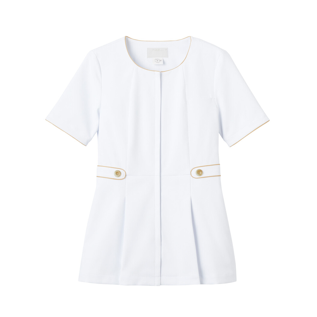 上品にスタイルアップするデザインと清潔感のあるカラーが魅力のレディーススクラブ。使用している素材のノンPUストレッチは、伸縮性とイージーケア性に優れたバランスの取れた素材です。ウエストベルトにタブをつけてウエストマークすることで、メリハリのあるシルエットに。配色のパイピングがポイントとなり、女性らしい印象を引き立てています。羽織って着られる前ファスナー仕様で着脱が楽チン。美容クリニックや受付、審美歯科などおもてなし職種向けのデザインが特徴のレディーススクラブです。