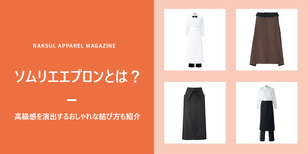 ソムリエエプロンとは、ひざ下より長いロング丈の腰エプロンの総称です。一般的には、前丈70〜90cmの腰エプロンを指します。ソムリエが着用することが多いので、ソムリエエプロンと呼ばれるようになりました。