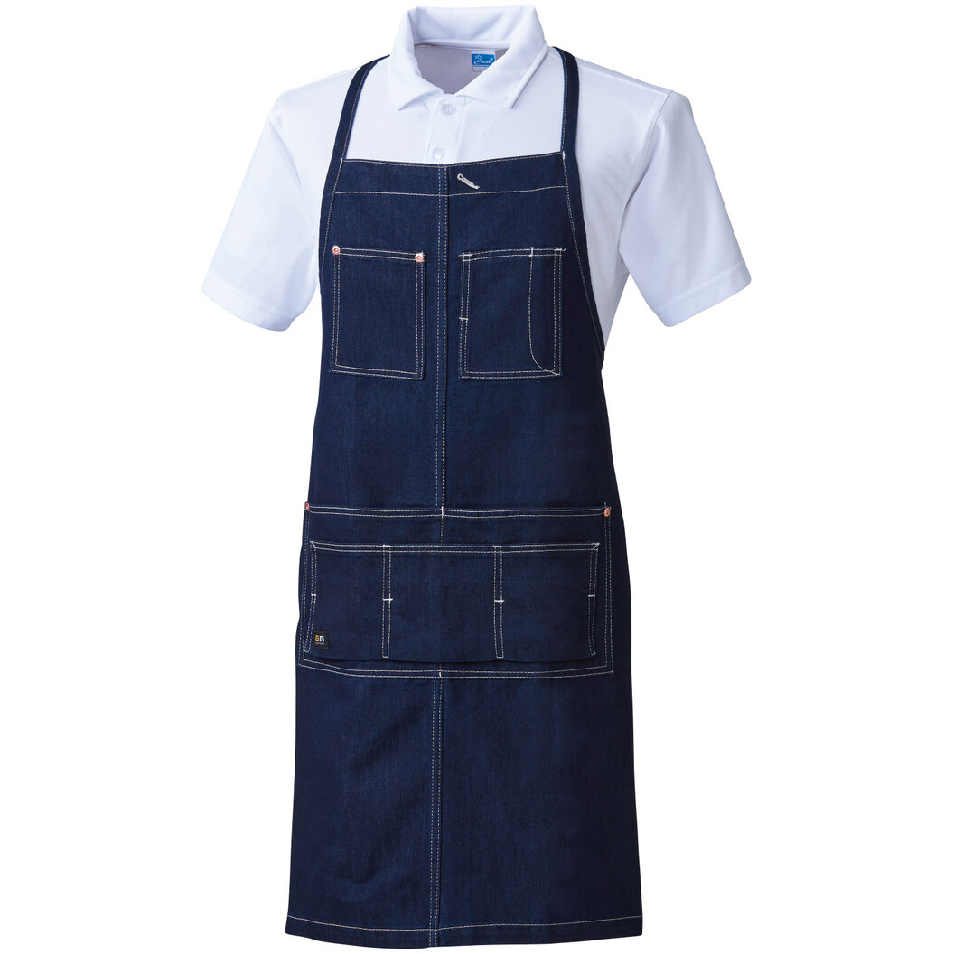 9.8oz(オンス)のCVCデニムを使用しています。おしゃれな首掛けエプロン!場所を選ばないシンプルデザイン。大き目のスマホも入る!製品洗いによるソフトな風合いと防縮性です。胸ポケット、胸ペン差し、多収納ポケット付き。