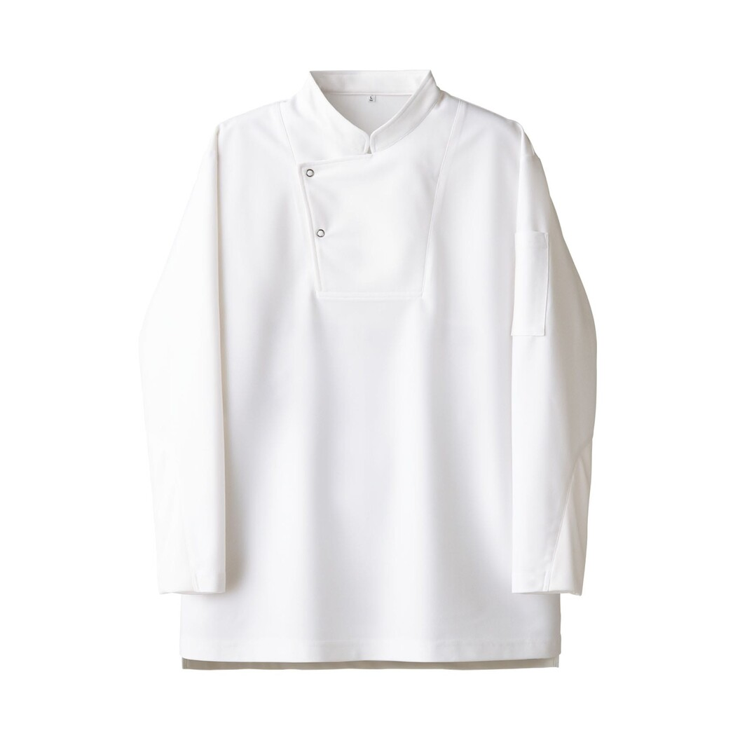 シェフ型Tシャツ長袖です。品格とユニフォーム機能を併せ持つTシャツ「qTシリーズ」の1つ。清潔感、信頼感、高品質、多機能かつTシャツの特性であるシンプルで手軽なカジュアル感ある新しいユニフォームアイテムです。ホテル、レストラン、アミューズメント等のサービスの進化は目まぐるしく、想像以上に素晴らしい。常にお客様に大きな新しい感動を与え続けている。既存のユニフォームでは思いのサービスに合わなくなってきているのも事実。そんな中で1つの提案、ハイクオリティーTシャツを開発。Tシャツアイテムに注目したのはそのカジュアルさと誰もが抵抗なく着れる気軽さ。これを昇華させることで彼らのコンセプトに合うサービスユニフォームが出来るのではないかという思いから。大きな特徴は3つ。カジュアルながらも高品質、かつ必要なユニフォーム機能があること。働く人が品よく素敵に見えること。商品がモダンデザインになっていて、かつ内装と調和すること。ぜひ体験して欲しい。シリーズ展開になっています。ボディー全て同じカッティングの長袖・半袖展開(サルエルパンツは別)。衿のみデザイン違いの5色展開(白とアイボリーは別)です。セクションで衿・色分けなども出来、まとまりのある空間作りも簡単に出来ます。