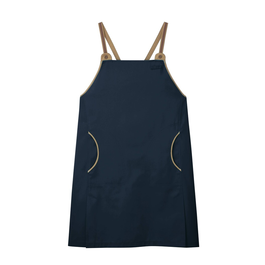 やわらか素材ボタンと華奢なデザインがかわいい肩紐付きエプロンです。 動きやすさにこだわった、アウトベンツ!ラウンドカットした大きめポケットがキュート! ネームプレート用のループ付きです。