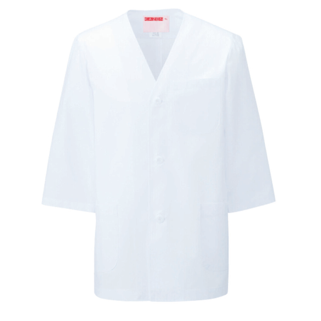 胸ポケット付きの、男子衿なし調理衣七分です。