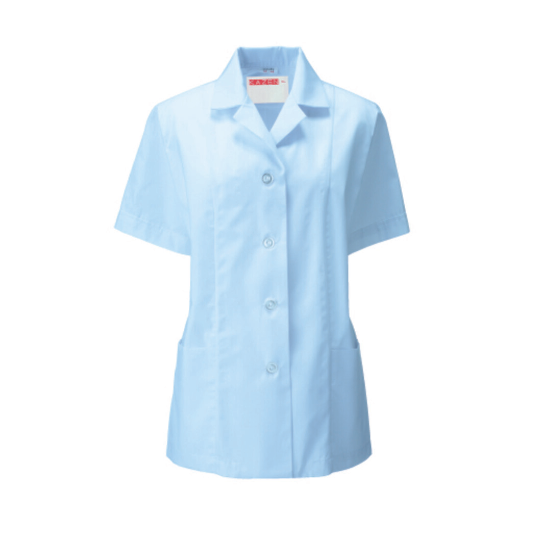 ポケット付きの、半袖の女子衿付調理衣です。