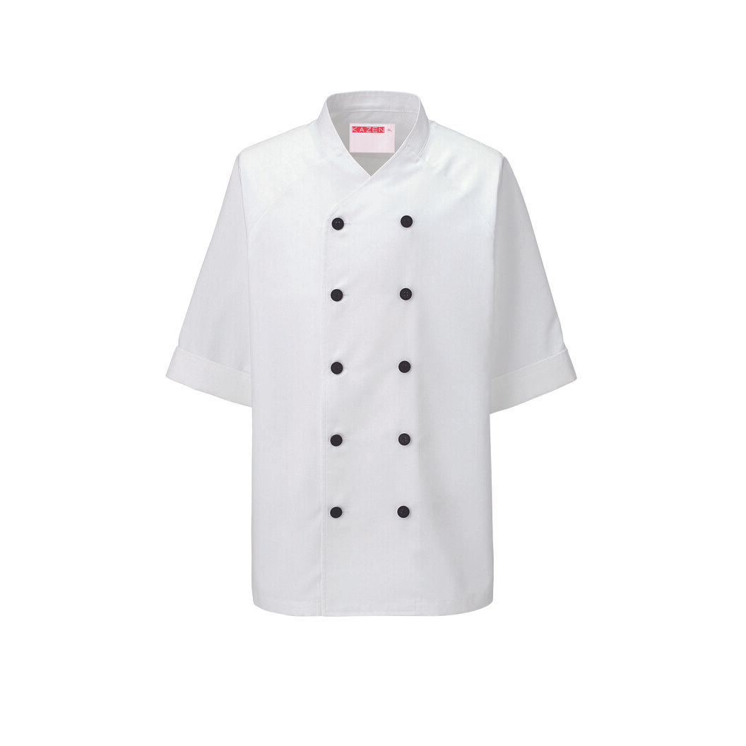 ローネックの衿元が爽やかなモノトーンコックシャツスタイル。 前衿がないV開きのすっきりしたデザインで、後ろはきっちりした印象のスタンドカラー。 首の前後運動において、衿があたる不快感がなく、立ち衿タイプと比べて熱がこもりにくく爽快な着心地です。