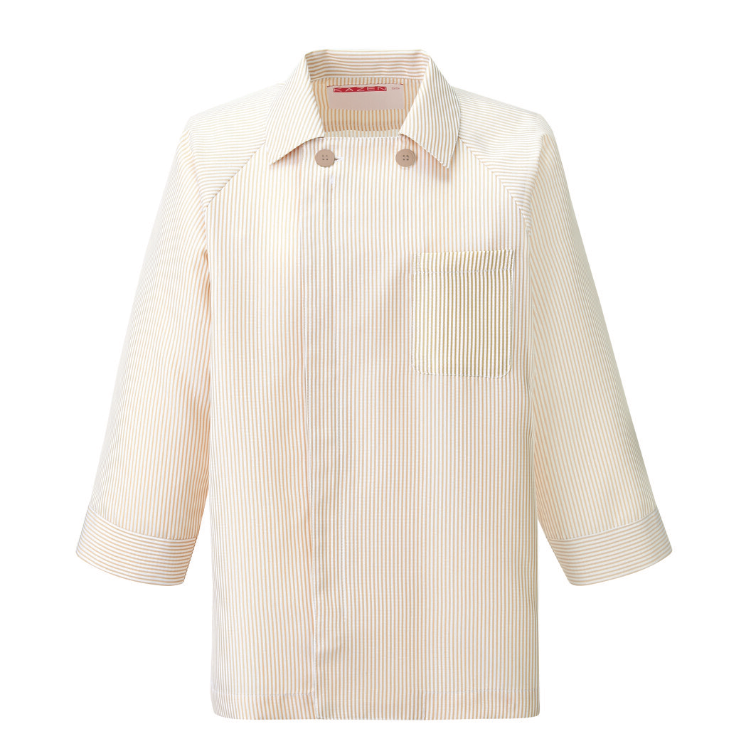 左胸ポケット付き、比翼ファスナー仕様の衿付きコックシャツです。