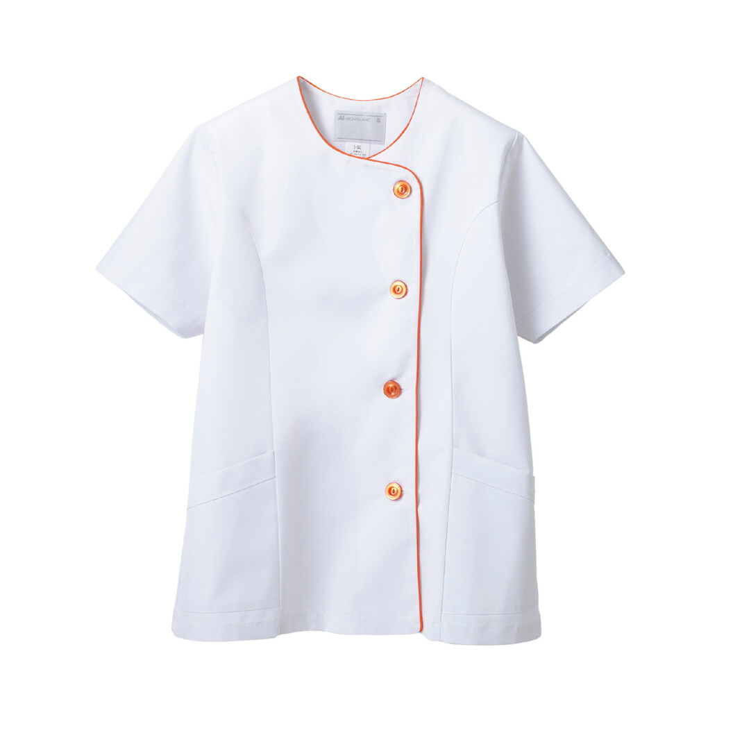 住商モンブランの調理衣です。 抗菌機能を付与したレディス半袖、パイピングカラーがポイント、イージーケア性に優れたスタンダードな調理衣です。