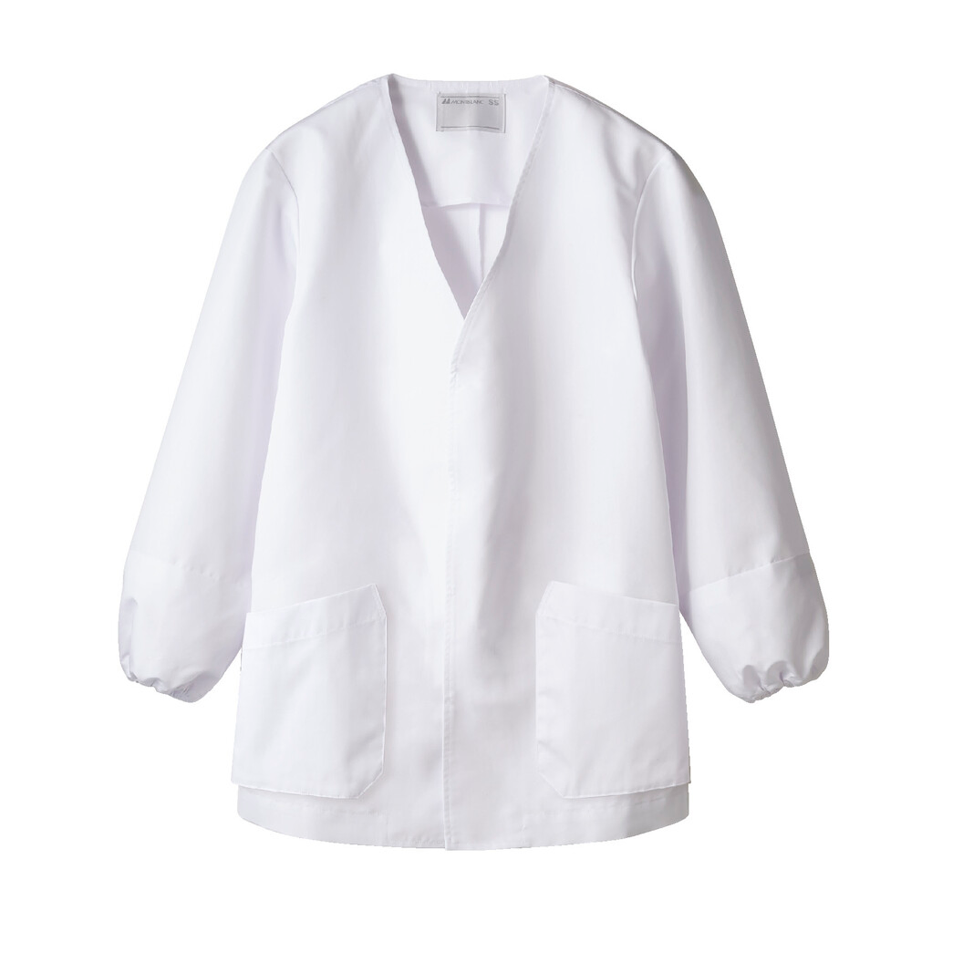 清潔感あるシンプルな白い調理衣です。 前立て部分をスナップボタンにすることで着脱がスムーズ。 見た目もスッキリした印象に。袖口はゴム仕様でさらに内側にはネットを付けているので、体毛などの落下を防いでくれて衛生面も安心。 SS〜5Lまでの豊富なサイズ展開をご用意しています。 耐久性に優れているので、調理などで汚れてしまった場合、強く洗うことも可能です。
