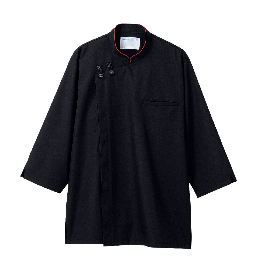 住商モンブランの調理用シャツ(男女兼用7分袖)です。 チャイナ服のようなアジアンテイストなデザインの調理シャツです。