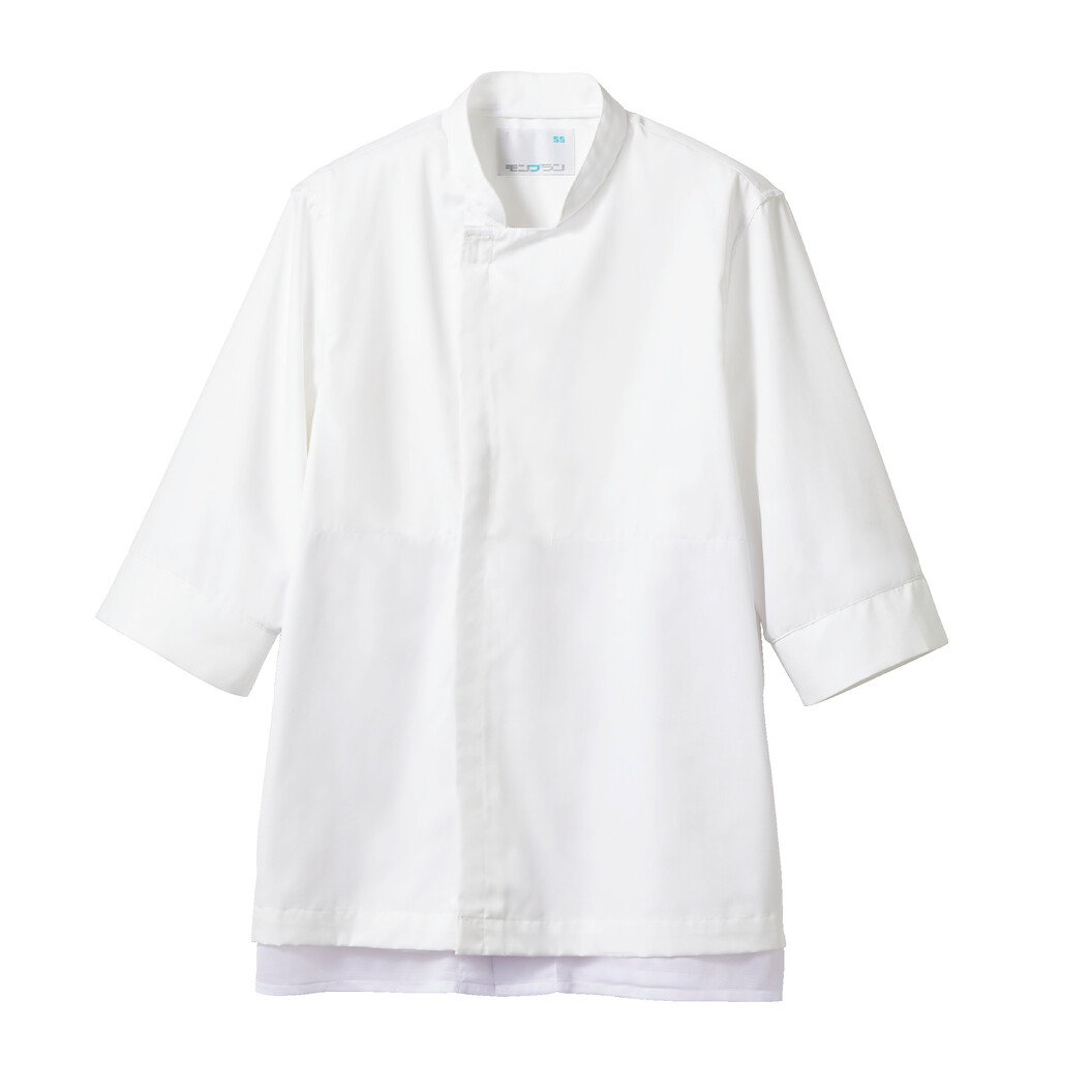 七分袖の男女兼用コックコートです。 体毛の落下を防止する袖口ネット、コートからの異物落下を防止する腰ネット付き。 左袖にペン差しポケット。動きやすさをサポートする背面プリーツ。 破損しにくいスナップ・ファスナーで破損による異物落下を防止します。 襟裏に濃色を配色することで襟裏汚れの目立ちをカバーします。 生地の端を表に出さず、ほつれや糸くずの発生を抑制するパイピング仕様です。