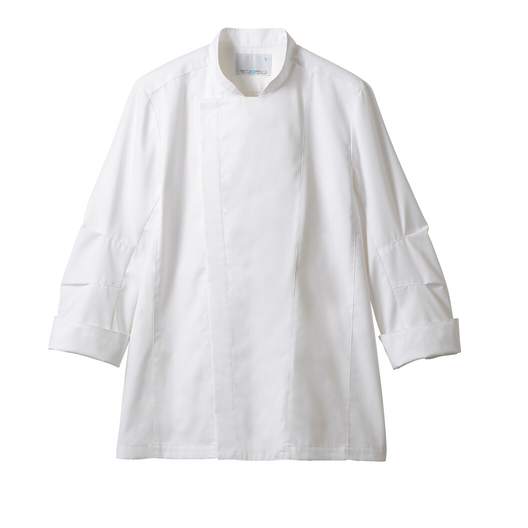 やわらかな着心地の素材を使用した長袖のコックコートです。 下を向くなどの首の動作によって起こる摩擦を軽減する襟設計です。 肩や腕の動きをスムーズにする背面アクションプリーツ。 メッシュ素材のベンチレーションで通気性を確保。 肘の曲げ伸ばしを快適にサポートするエルボータック。 強度があり、腐食・変色しにくいステンレス製のスナップボタン仕様です。 エプロンからの裾の吹き出しを防止する長めの着丈です。 SSサイズはレディス対応でやや細めのシルエットです。