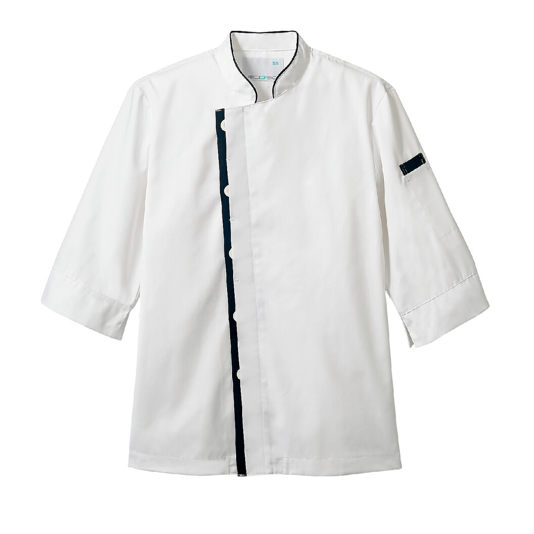 住商モンブランの男女兼用7分袖コックコートです。 和洋中ジャンルを問わず、誰にでも着こなしやすいベーシックなフォルムです。 アシンメトリーな比翼の合わせから、ボタンがのぞく凝ったデザインがポイント。 モダンな印象の黒×ライトグレーは、お店の格を高めてくれる上品な仕上がりです。 やさしい色合いのベージュ×ブラウンは、自然食品やオーガニックフードとの相性も抜群です。 7分袖で調理しやすく、袖口の内臓ネットで異物の落下も防止。 左袖にはペンさしポケットも付いています。ボタンも熱や薬品に強く割れにくいため、異物混入リスクを低減します。 安心・安全な衛生管理を実現する、リテイルハサップ推奨商品。