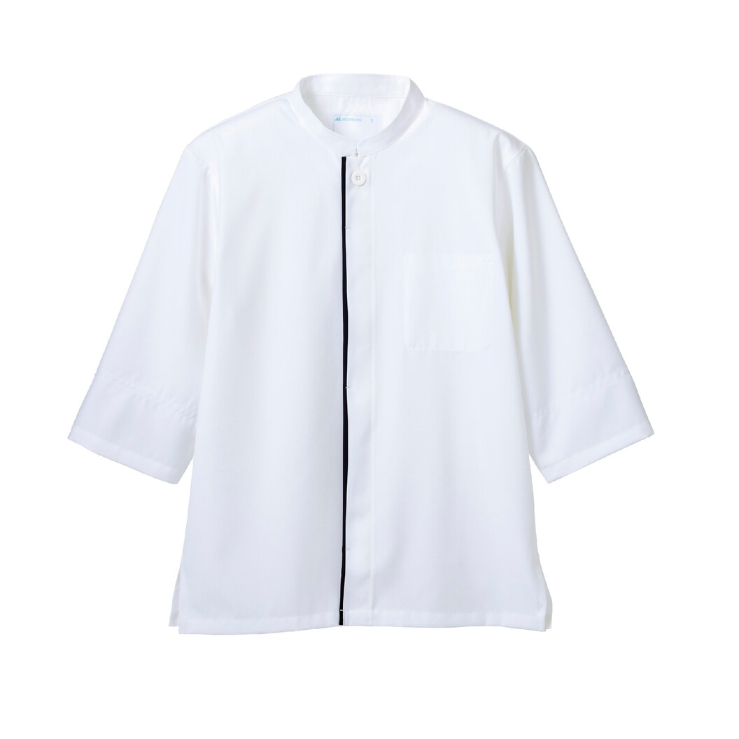 防汚・制電機能を付与した男女兼用7分袖、袖口ネット付、シンプルなデザインの中にセンターラインがアクセントなコックコートです。
