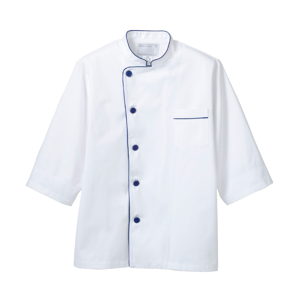7分袖、清潔感に彩りを添えるさわやかなコックコートです。