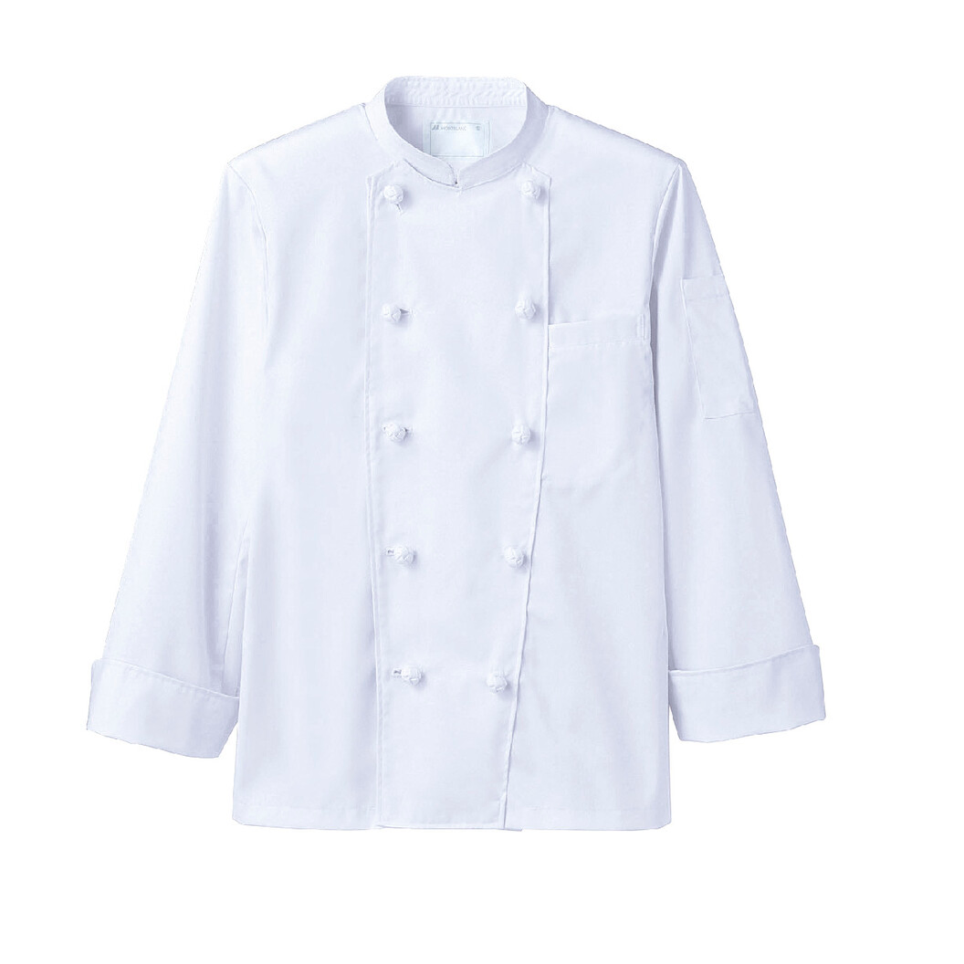 前合わせは右前、左前どちらでも、スタンダードな長袖コックコートです。 抗菌・制電機能を付与しました。