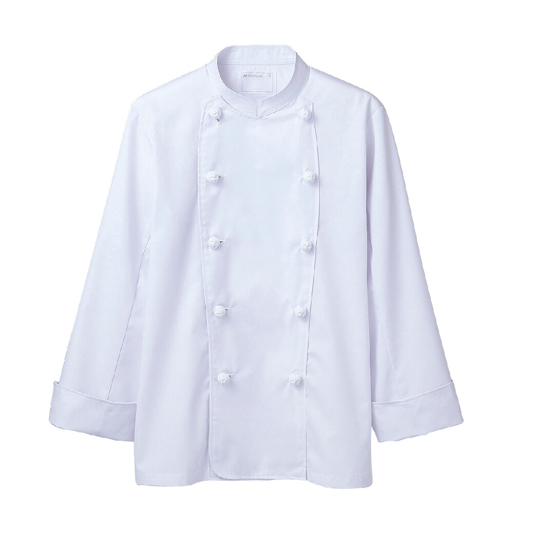 前合わせは右前、左前どちらでも、スタンダードな長袖コックコートです。 抗菌・制電機能を付与しました。